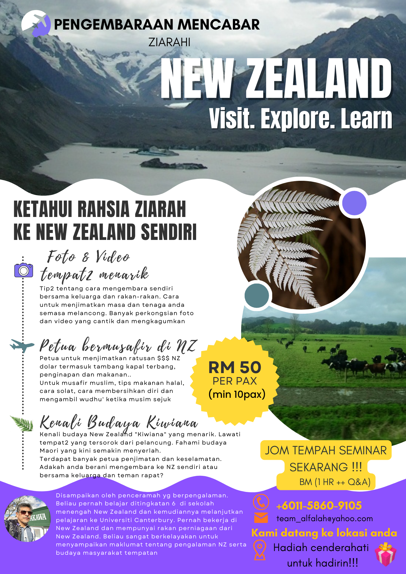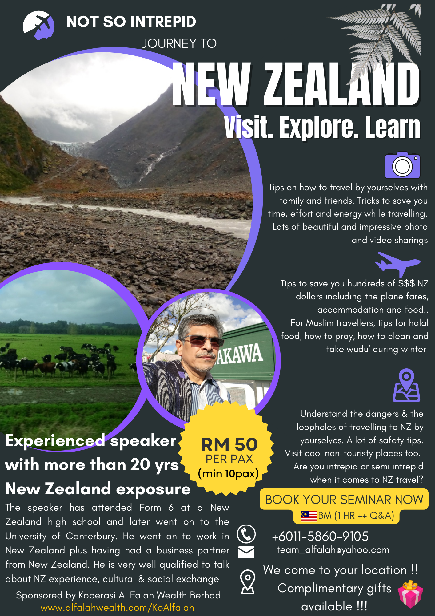 This 1 hour seminar (face to face) in Bahasa Melayu is fun for those who wants to explore New Zealand on your own. Learn the tips and tricks from someone who went to High School there and have lived there since 1983.
